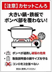 カセットコンロを並べて使用したり、本体より大きい鍋やフライパンを使用したりすると、鍋底や隣のコンロの熱がカセットボンベに伝わり、ボンベが異常加熱して破裂や火災につながるおそれがあります。