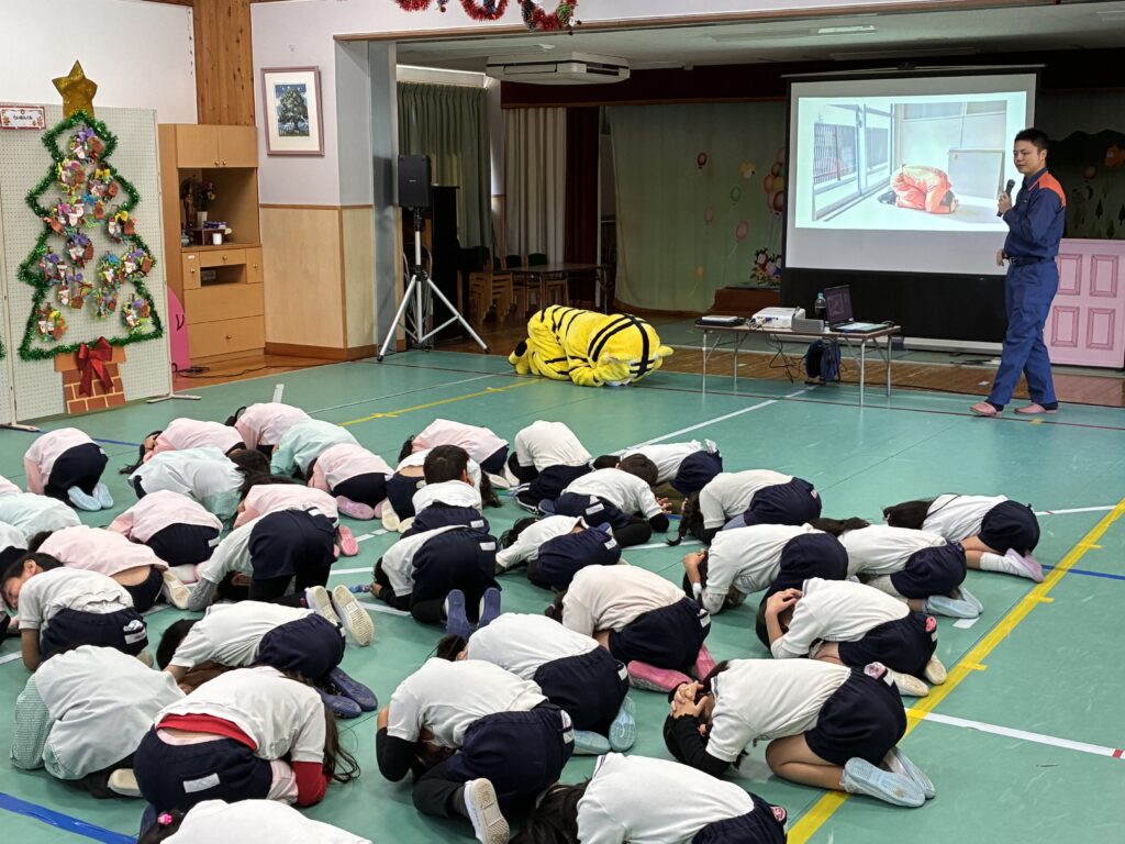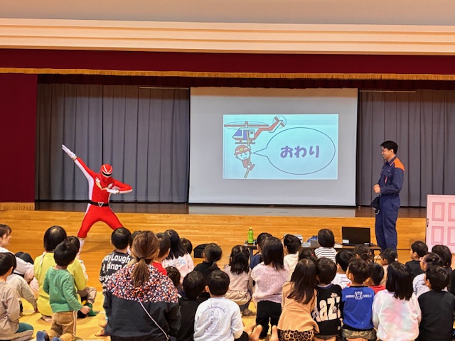 中濃消防組合では、「火遊びはしません。してはいけません。」や「おさない。かけない。しゃべらない。」といったこれまでの幼児期の防火教育に加え、もし衣服に火が着いたときや火災に遭遇したときにどうするか、地震が起きたときにどのように身を守るかについて、サバイバル的な対処方法、知恵を身につけてもらうため、着ぐるみや戦隊者などを使って楽しく学べる「幼児防火防災教育」を行っています。