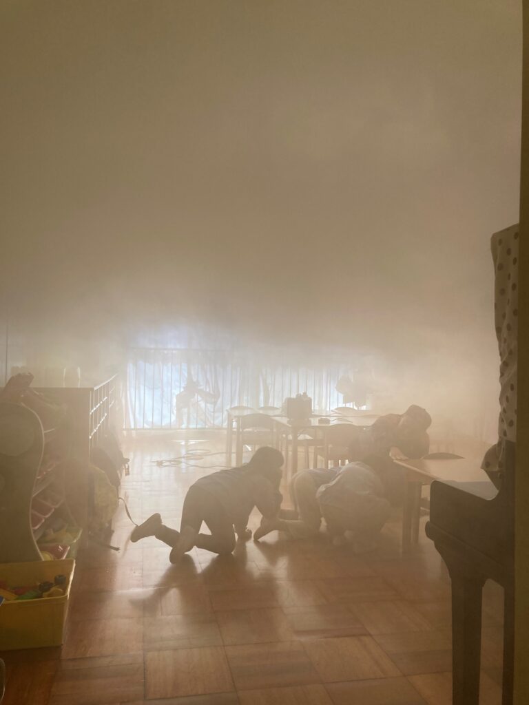 実際に煙をたいて、視界の悪い部屋の中を脱出します。