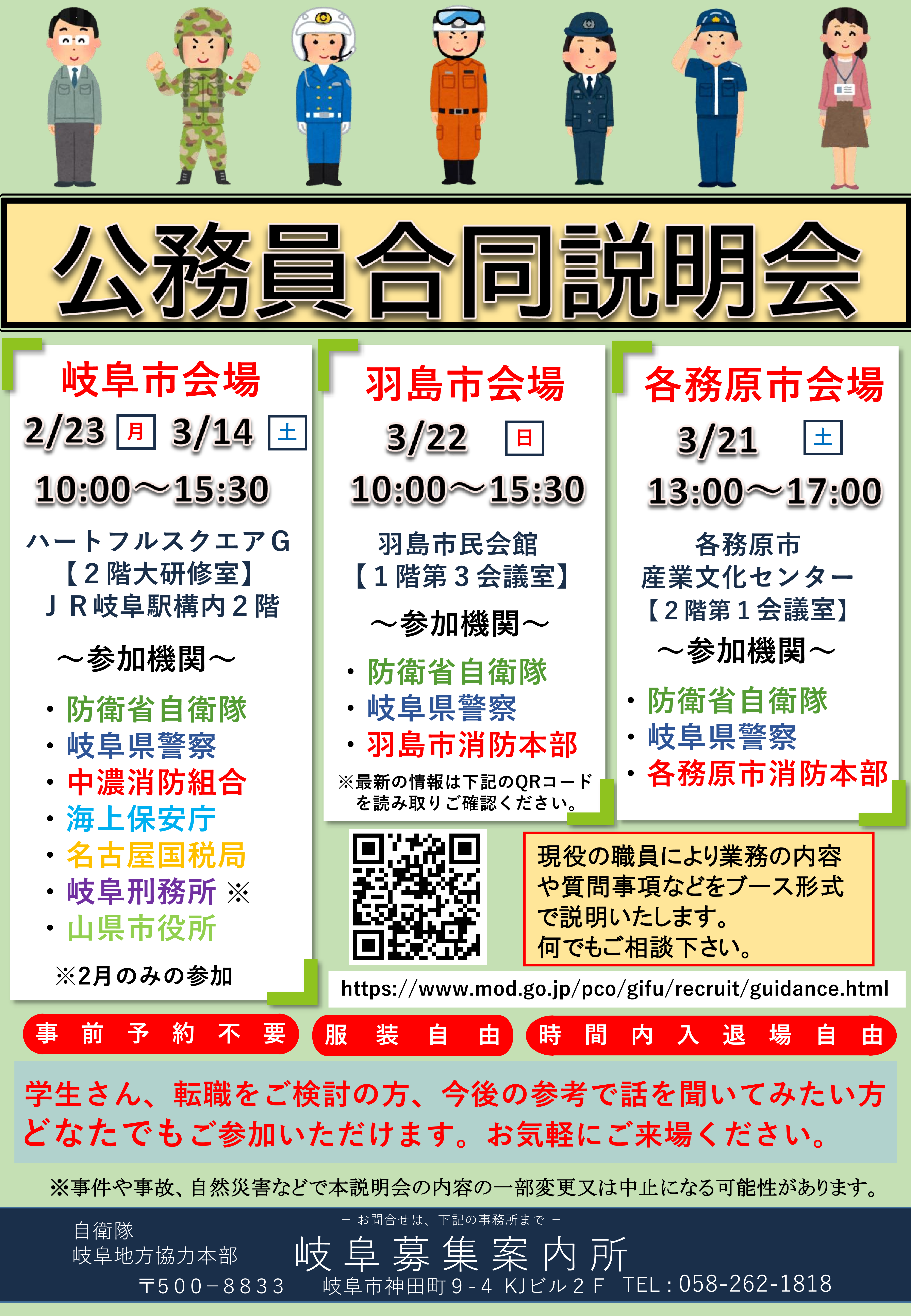 説明会情報 公務員合同説明会を開催します! 2026年4月18日(土) 10:00~16:00 参加時間内で自由に参加可能。申し込み不要です。 親子での参加、保護者の方だけでの参加も歓迎! 参加機関:関市役所、郡上市役所、警察、刑務所、自衛隊、郡上市消防本部 など 人々のために働きたいという意欲のある方、いろいろな組織のお話を聞いて 比較検討しても良いと思いますよ! 会場:わかくさ・プラザ(多目的ホール) 住所 関市若草通2丁目1 公務員合同説明会を開催! 令和7年3月23日(日) 10:00~16:00 参加時間内で自由に参加可能! 申し込み不要! 親子での参加、保護者の方だけでの参加も歓迎! 消防以外にも、関市役所・警察・海上保安庁・刑務所・自衛隊など人々のために働きたいという意欲のある方、いろいろな組織のお話を聞いて比較検討しても良いと思いますよ! 会場:わかくさ・プラザ(多目的ホール) 住所 関市若草通2丁目1 以下は終了した説明会です。 例年開催予定ですので参考にしてください。 公務員合同説明会に参加します! 日時 2026年2月23日(月・祝)10:00~15:30 2026年3月14日(土) 10:00~15:30 会場 ハートフルスクエアG【2階大研修室】 (JR岐阜駅構内2階) 住所 岐阜県岐阜市橋本町1丁目10-23 事前予約不要! 服装自由! 時間内入退場自由! 当日は総務課長または主幹が参加します! 親子での参加もOK! 保護者の方だけで「消防」という職場について聞きに来てもOKです! 消防以外にも、自衛隊・警察・海上保安庁・名古屋国税局・山県市役所などが参加します。 人々のために働きたいという意欲のある方、いろいろな組織のお話を聞いて 比較検討しても良いと思いますよ! 急遽、採用説明会を開催します! 令和7年7月26日(土)9:30~16:00 中濃消防組合 大会議室 クリックで拡大します 部活や授業、遠方にいるなど、様々な理由でこれまで説明会に参加できなかった方、単純にこれまでの機会を逃した方、就活しているけどもっと熱くなれる仕事を求めている方、たまたま、インスタグラムで興味をもってここへ来た方、とにかく一度説明を聞いてみませんか? 今回は、説明を聞いてみて、受験したいと思った人は、その場で申込書に必要事項を記入できます。顔写真も撮影しますので、こんなにいい機会はありません! 気になったなら、来るしかないですよ! お待ちしています。 公務員合同説明会を開催! 令和7年7月12日(土) 10:00~16:00 参加時間内で自由に参加可能! 申し込み不要! 親子での参加、保護者の方だけでの参加も歓迎! 消防以外にも、関市役所・警察・海上保安庁・刑務所・自衛隊など人々のために働きたいという意欲のある方、いろいろな組織のお話を聞いて比較検討しても良いと思いますよ! 会場:わかくさ・プラザ(総合福祉会館3階 会議室) 住所 関市若草通2丁目1 公務員合同説明会を開催! 令和7年3月23日(日) 10:00~16:00 参加時間内で自由に参加可能! 申し込み不要! 親子での参加、保護者の方だけでの参加も歓迎! 消防以外にも、関市役所・警察・海上保安庁・刑務所・自衛隊など人々のために働きたいという意欲のある方、いろいろな組織のお話を聞いて比較検討しても良いと思いますよ! 会場:わかくさ・プラザ(多目的ホール) 住所 関市若草通2丁目1 Facebook Twitter LINE