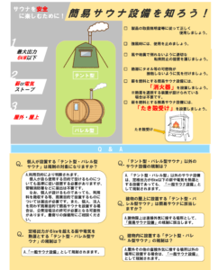 ・屋外等のテント型及びバレル型(木樽)に設ける放熱設備(最大出力6㎾以下の薪ストーブ電気ストーブ)を「簡易サウナ設備」として設置基準を区分しました。